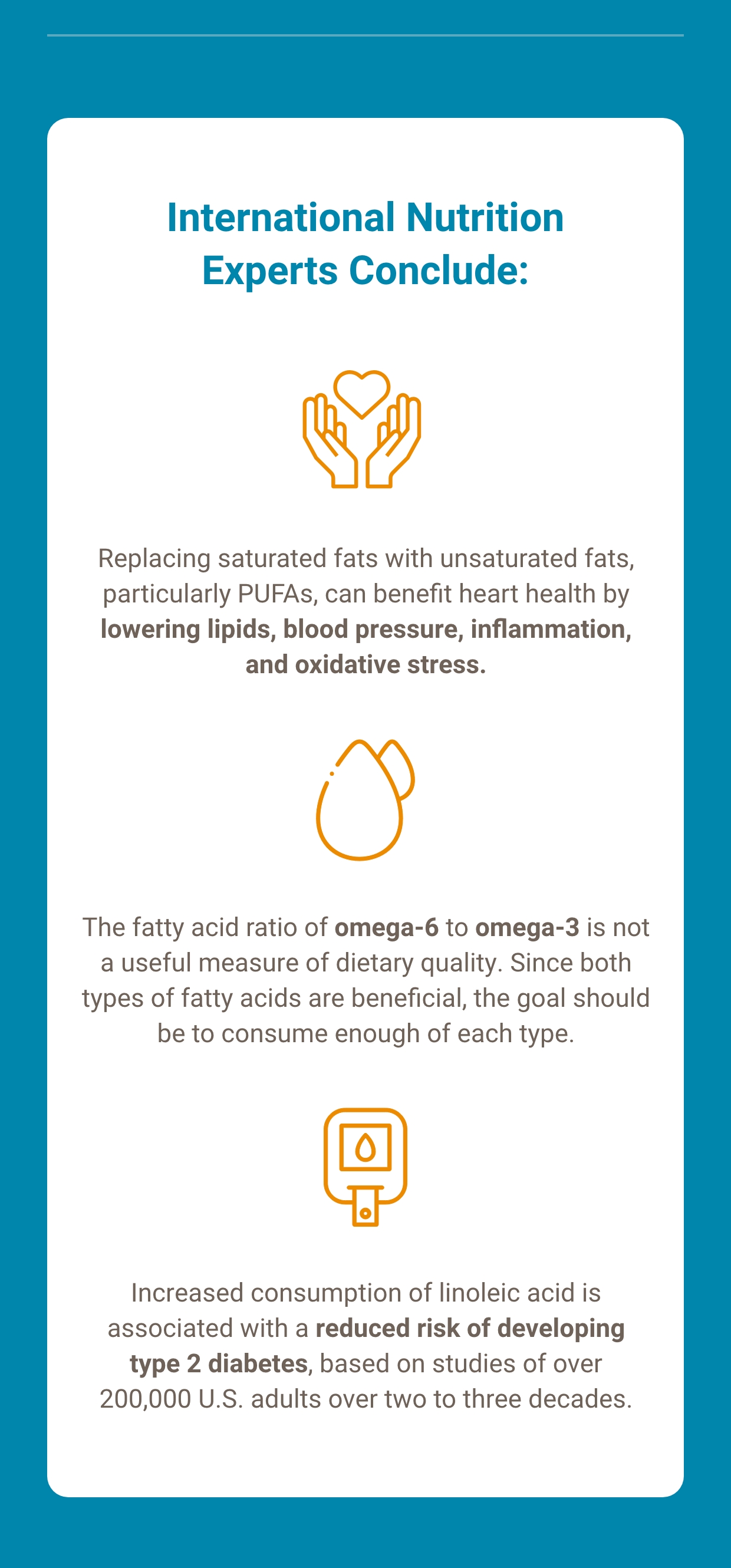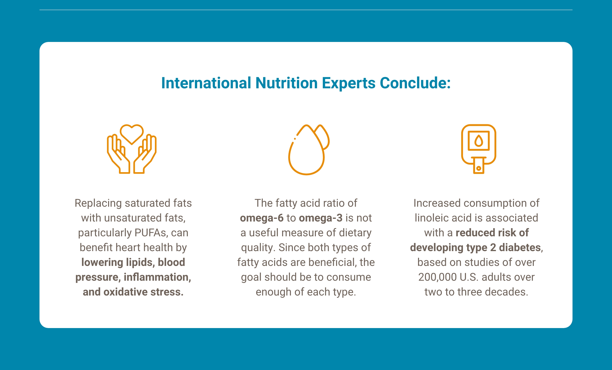 Population studies show that higher intake and biomarkers of intake of the omega-6 polyunsaturated fatty acid (PUFA) linoleic acid are associated with lower risk of cardiovascular disease (CVD), coronary heart disease, type 2 diabetes, and overall mortality. This essential fatty acid is found in a subset of vegetable oils derived from seeds, including soybean oil.